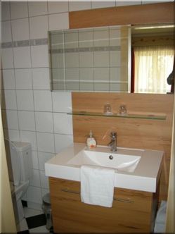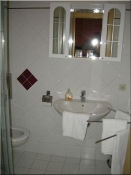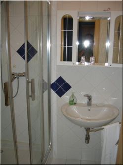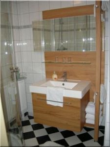 Maritimer Charme und ein geräumiges Badezimmer zeichnen das Seerosenzimmer aus. Starten Sie vom Arkadenhof zu ausgiebigen Rad- oder Wandertouren in den Süden oder Westen!