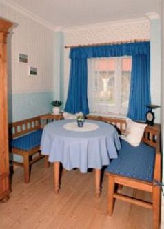 Das Sonnenblumenzimmer ist ein Garant für gute Laune. Eine gemütliche Essecke und ein Badezimmer im rustikalen, behaglichen Stil ermöglichen entspannte Urlaubsstunden.